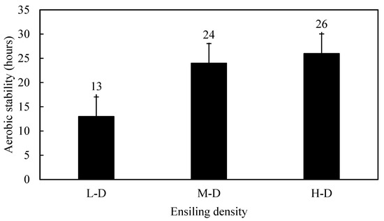 Effect of ensiling density on aerobic stability of rice straw silage. L-D, low density (500 g/L); M-D, medium density (600 g/L); H-D, high density (700 g/L). Columns with different superscripts are significantly different (p < 0.05).