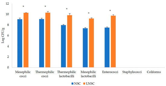 Microbial counts performed on the starter culture object of this study (NSC) and its lyophilized form (LNSC) revealed that the concentration of viable cells in LNSC was always 1.2–2.2 Log CFU/g higher than in NSC (Figure 1). Indeed, mesophilic and thermophilic cocci, mesophilic and thermophilic bacilli, as well as enterococci, were always significantly (p < 0.05) higher in LNSC. Staphylococci and coliforms were not detected in NSC nor in LNSC.
