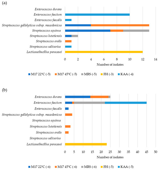 Bacterial species isolated from the natural cultures NSC (a) and LNSC (b). From each medium (M17 incubated at 22 °C, M17 incubated at 45 °C, MRS, FH, and KAA) and serial 10-fold dilution (in brackets), the numbers of isolates are indicated.