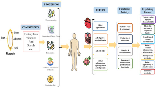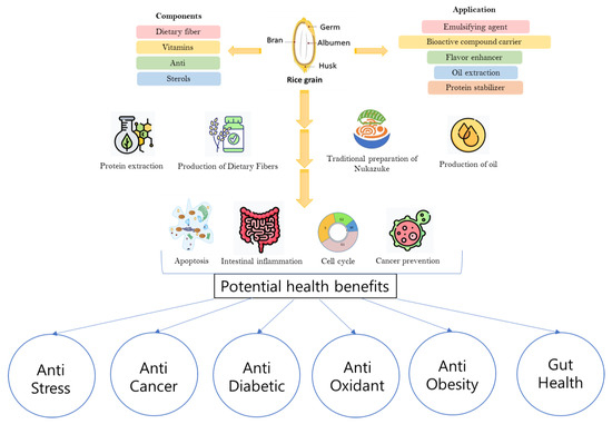 The anti-obesity activity of processed brown rice could be attributed to various factors (Figure 5). Dietary fiber, which is more abundant in brown rice compared to white rice, can enhance satiety, potentially reducing food intake [15]. This fiber could also reduce the absorption of some dietary fats and influence the release of hunger-regulating hormones. When processed brown rice underwent specific cooking and cooling methods, an increase in resistant starch was observed. This starch type was not easily digested in the small intestine and got fermented in the large intestine, which was associated with benefits like improved insulin sensitivity and potential anti-obesity effects [13,22]. As for the cholesterol-lowering properties of processed brown rice, there was an observed increase in phytosterols and saponins, both known to aid in reducing cholesterol [7]. Phytosterols hinder cholesterol absorption in the intestines, and saponins could bind to cholesterol, preventing its reabsorption. Moreover, the elevated levels of ferulic acid in fermented brown rice bran, known for its antioxidant properties, positively influence cholesterol metabolism [7]. Additionally, γ-Oryzanol reduces overall cholesterol levels, and dietary fiber in brown rice binds to cholesterol, decreasing its absorption in the gut. The potential health advantages of brown rice depend on its processing methods and refining degree [13]. Minimal processing, which retains most of the bran and germ, is generally perceived as beneficial. However, individual responses can differ. It is essential to view these health benefits as components of a well-rounded diet and healthy lifestyle. For significant dietary changes, consultation with a healthcare or nutrition professional is always recommended.