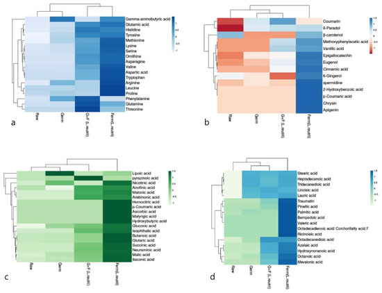 (a) Represents a comprehensive analysis of amino acid levels in various rice samples: raw, germinated, fermented with L. reuteri, and a combination of germination and fermentation (G+F) with L. reuteri. The figure uses a heat map with varying shades of blue to illustrate the differences in amino acid concentrations among these samples, providing a clear visual comparison; in (b), the focus shifts to the levels of phenolic compounds in the same types of rice samples. This section employs a heat map that transitions from blue to red, with the intensity of the color indicating the concentration of phenolic compounds. The color gradient allows for an immediate visual interpretation of the phenolic content, with red representing higher levels and blue indicating lower levels; (c) explores the levels of organic acids in the raw, germinated, fermented (L. reuteri), and G+F (L. reuteri) rice samples. Here, the heat map employs a color spectrum from green to white, where green signifies higher concentrations of organic acids, and white indicates lower concentrations. This visual tool effectively demonstrates the variation in organic acid content across different rice processing methods. (d) examines the fatty acid levels in these rice samples. The heat map for this section uses a color range from blue to green, where blue represents higher fatty acid levels and green shows lower levels. This visual representation provides an intuitive understanding of how fatty acid content varies between the raw, germinated, fermented, and G+F samples (Source of the figure: reference [1,8]).