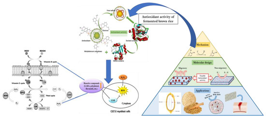 Visual representation of the role of the antioxidant mechanism and its application in microbial fermented brown rice. This figure is designed to elucidate the complex interactions and benefits of antioxidants in fermented brown rice, emphasizing how fermentation enhances the bioavailability and efficacy of these antioxidants. It highlights the specific types of antioxidants present in brown rice and how microbial fermentation, particularly with beneficial bacteria, can increase their potency. The figure also showcases various applications of this process, illustrating how enhanced antioxidant activity in fermented brown rice can contribute to improved health outcomes, such as better oxidative stress management, increased nutritional value, and potential therapeutic uses. Additionally, the diagram indicates the biochemical pathways involved in antioxidant activity, providing a comprehensive view of the process from fermentation to the enhanced health benefits.