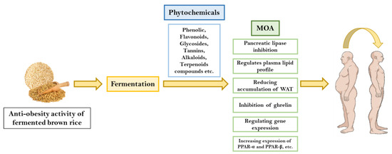 Schematic representation that details the phytochemical composition of processed (fermented) brown rice and its anti-obesity effects. This diagram focuses on identifying and illustrating the various phytochemicals that are either inherent in brown rice or enhanced through the fermentation process. It elaborates on how these phytochemicals contribute to combating obesity. The representation outlines the metabolic pathways influenced by these compounds, including their roles in fat metabolism, appetite regulation, and insulin sensitivity. The different color squares were provided for the different phytochemicals because of different categories and the application also widely applied. Additionally, the figure illustrates the specific anti-obesity mechanisms, such as the reduction in adipose tissue, inhibition of lipid accumulation, and enhancement of energy expenditure. This schematic aims to visually convey the complex interactions between the phytochemicals in fermented brown rice and their potential health benefits, particularly in the context of obesity prevention and management.
