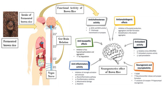 The brain, housed within the skull, alongside the spinal cord, constitutes the central nervous system. Positioned at the central control point of our bodily systems, it performs myriad functions including muscle coordination, sensory information processing, language, learning and memory, homeostasis maintenance, and hormone secretion. Even at rest, the brain consumes about 20% of inhaled oxygen. Being highly metabolically active, it necessitates a consistent oxygen supply to maintain regular physiological functions [17]. Nonetheless, oxygen consumption produces free radicals, increasing the demand for more oxygen, which in turn escalates reactive oxygen species (ROS) production. As suggested by Shukla et al. [32], ROS might be implicated in the pathogenesis of various neurodegenerative disorders like Parkinson’s disease, Alzheimer’s disease, multiple sclerosis, and motor neuron disease. Phani Kumar et al. [33] posited that among the different ROS, H2O2 predominantly induces cell death via the apoptotic pathway. The research of Divate et al. [34] revealed that brown rice fermented with Xylaria nigripes significantly enhances neuro-protective potential, with an ethanol extract from Xylaria nigripes fermented brown rice offering optimum protection against H2O2-induced damage. Moreover, peptides from brown rice fermented by Limosilactobacillus reuteri were shown to counteract H2O2-induced cellular damage [20]. Rice bran, discarded during white rice production, differentiates brown rice from its white counterpart. Studies have demonstrated that rice bran fermented with Lactobacillus plantarum Hong (KFCC 11556P) can shield neurons from damage, particularly from hydrogen peroxide, and might also rejuvenate or bolster functionality [35] (Figure 6).