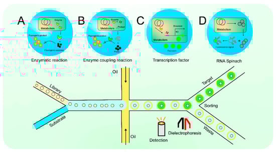 In the screening system of droplet microfluidics, microdroplets of picoliter (pL) volume as reactors are used to encapsulate enzyme genes, artificially constructed metabolic pathways, gene expression products, etc., which are colored using specific fluorescent probes (Figure 2 top row). In the bottom row of Figure 2, a microfluidic detection/sorting chip for the efficient analysis and sorting of these microdroplets can be seen. Figure 2A shows that screening based on fluorescence spectroscopy is dependent on enzyme reactions. The enzymatic reaction products have a strong fluorescent signal, which is used to quantify the enzyme activity based on the change in fluorescence intensity before and after the reaction [57]. Figure 2B shows how small molecules can be indirectly converted to fluorescent signals using an enzyme coupling reaction strategy [68]. Figure 2C outlines an assay screening process based on transcription factors (TFs) [73]. TFs-based biosensors, which can respond to different types of effectors, are widely used for the HTS of metabolites, including amino acids, organic acids, flavonoids, sugars, and lipids. Figure 2D displays biosensors based on RNA Spinach [53]. RNA Spinach is a newly discovered special structure that generates stable signals when combined with fluorescent groups.