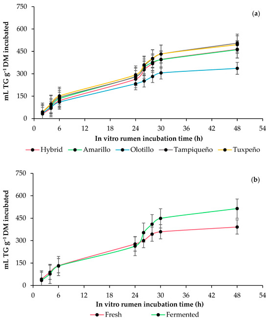In vitro rumen total gas (TG) production kinetics of whole-plant maize (Zea mays L.): (a) effect of genotype (Amarillo, Hybrid, Olotillo, Tampiqueño and Tuxpeño) and (b) anaerobic fermentation of the whole-plant maize (fresh or fermented). The bars at each point indicate the standard error of the mean.