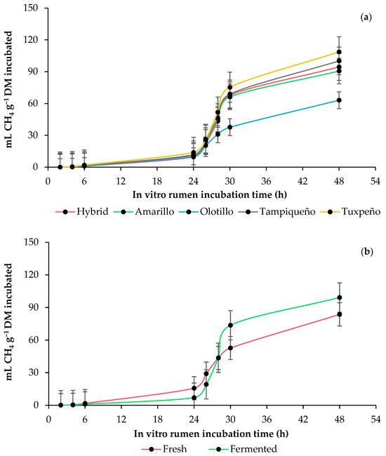 In vitro rumen methane (CH4) production kinetics of whole-plant maize (Zea mays L.): (a) effect of genotype (Amarillo, Hybrid, Olotillo, Tampiqueño and Tuxpeño) and (b) anaerobic fermentation of the whole-plant maize (fresh or fermented). The bars at each point indicate the standard error of the mean.