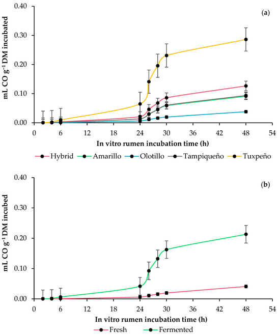 In vitro rumen carbon monoxide (CO) production kinetics of whole-plant maize (Zea mays L.): (a) effect of genotype (Amarillo, Hybrid, Olotillo, Tampiqueño and Tuxpeño) and (b) anaerobic fermentation of the whole-plant maize (fresh or fermented). The bars at each point indicate the standard error of the mean.