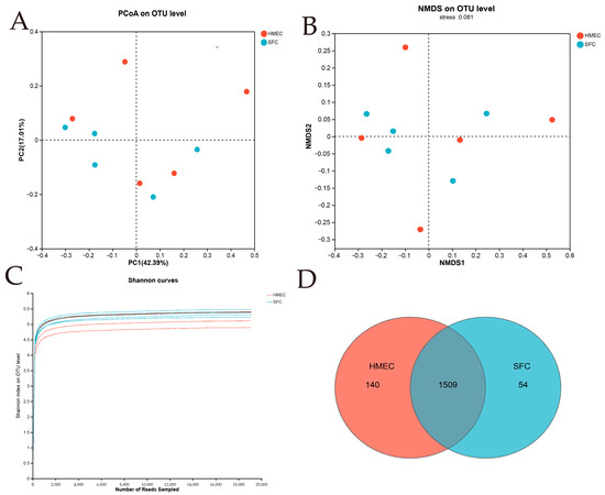 The impact of replacing dietary SFC with HMEC on the composition of the ruminal microbiome in two groups of dairy cows. (A) Principal coordinate analysis (PCoA) of beta diversity. (B) Non-metric multidimensional scaling analysis (NMDS) of beta diversity. (C) Rarefaction curve. (D) Venn diagram. OTU, operational taxonomic unit.