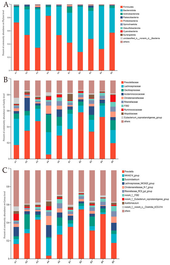 Relative abundances of ruminal microbes in the two feeding groups at three taxonomic levels: phylum (A), family (B), and genus (C). The HMEC group consists of A1–A5, and the SFC group consists of B1–B5.