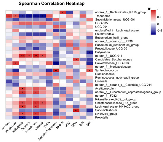 Spearman correlation analysis revealed significant associations between microbial genera found in the rumen, serum indicators, and ruminal fermentation indices (Figure 3). Treponema exhibited positive correlations with acetate and propionate, but negative correlations with isobutyrate, butyrate, and valerate. In contrast, Norank-f-UCG-001 displayed positive correlations with all of these acids. The A:P ratio and IgM levels were found to be positively correlated with Syntrophococcus.