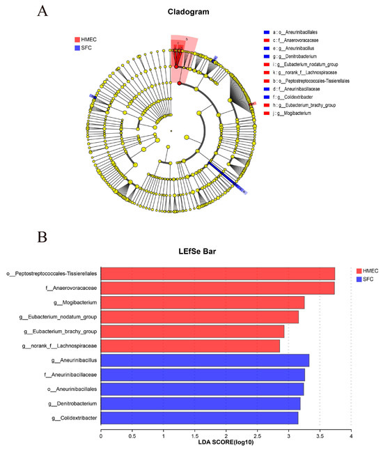 Linear discriminant analysis effect size (LEfSe) analysis of the microbial communities in cows fed with HMEC or SFC. (A) Evolutionary branching diagram. (B) Bar graph of linear discriminant analysis (LDA) scores in the two groups.