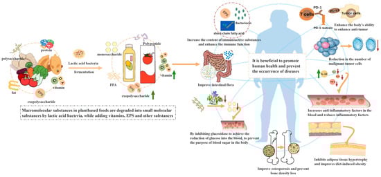 Lactic acid bacteria can enhance the ability of the body to fight against diseases by activating macrophages, promoting cell division, and producing antibodies [111]. Numerous studies have demonstrated that certain lactic acid bacteria have the capacity to inhibit colonic carcinoma, liver cancer, and lung cancer, both in vivo and in vitro [112]. Furthermore, during the fermentation process of food, certain lactic acid bacteria can enhance immune activity by secreting active substances with immunomodulatory functions [113]. The fermentation of herbs by lactic acid bacteria can increase the bioavailability and release of immune-active substances, such as polysaccharides, saponins, and polyphenols, which possess strong immunomodulatory activity. The oral intake of lactic-acid-bacteria-fermented herbs can promote intestinal secretion of immunomodulatory-active metabolites, such as EPS, short-chain fatty acids, and bacteriocins [114]. It was found that mice that ingested lychee juice fermented by L. casei could have an enhanced immunomodulatory activity. This effect is achieved by stimulating the spleen and thymus, as well as promoting the secretion of cytokines (IL-2, IL-6) and immunoglobulins (IgA, IgG, and SIgA) [115]. Nishioka et al. studied the effects of Sparassis crispa (SC) and lactic-acid-bacteria-fermented SC (SCL) on innate immunity. The SCL group significantly enhanced the accumulation of phagocytes, immunocytes, and C-C chemokine receptor-type-2- or phospho-Sky-expressing cells in the jejunum epithelial villi and spleen. The SCL group significantly enhanced the expression of genes involved in encoding various innate immune-related factors in a dose-dependent manner. In addition, the study found that the SCL group strengthened the phagocytosis of human monocytes against Escherichia coli, which is related to the β (1-3)-glucan in SC. The results showed that the oral administration of SCL significantly enhances innate immunity in mice and possibly humans [116]. Xeniji, a functional food made by fermenting various fruits and vegetables with lactic acid bacteria (L. brevis, L. casei, etc.), has been shown to activate T-lymphocytes and the cytotoxicity of natural killer (NK) and lymphokine-activated killer (LAK) cells in mice, thereby enhancing immunity [117].