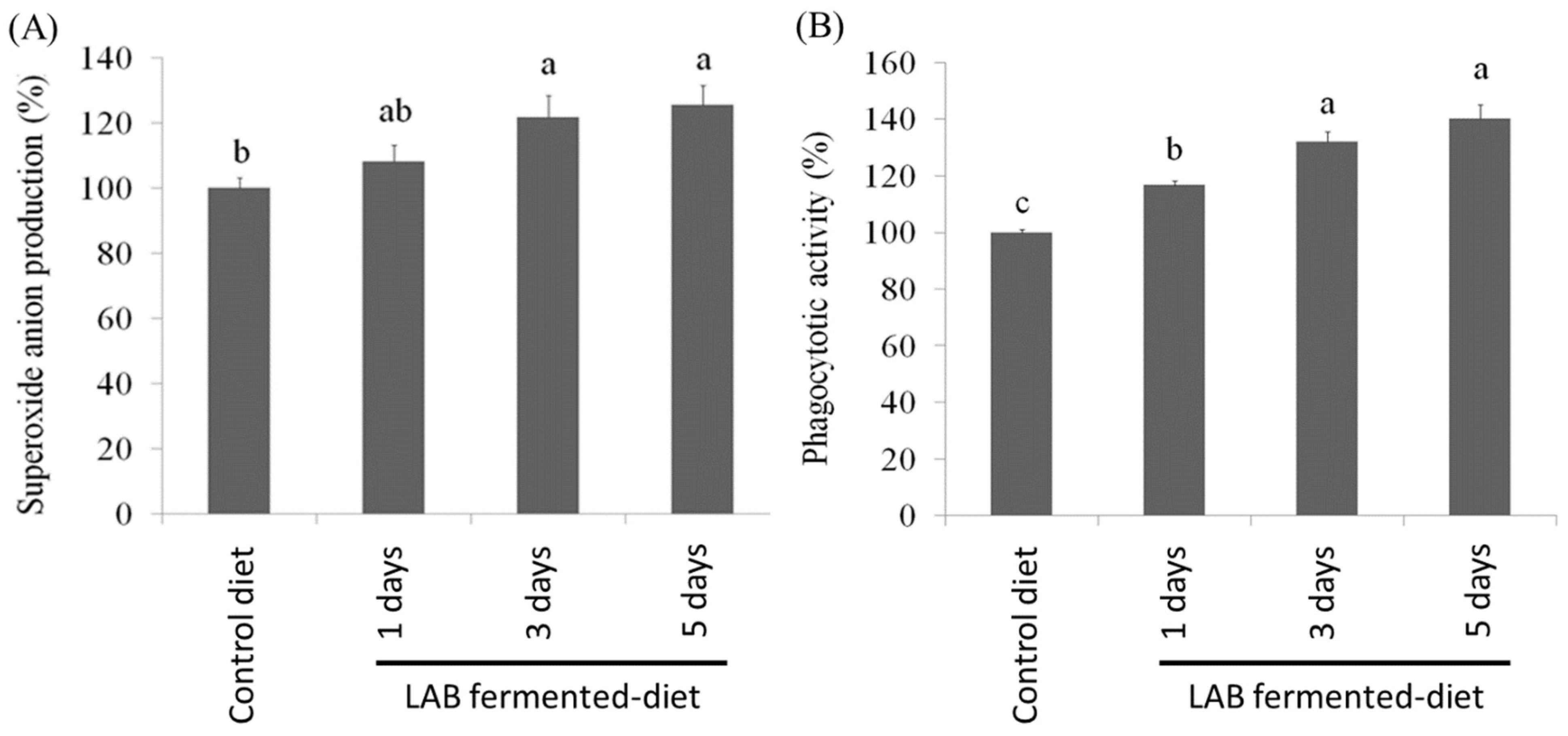 3.3. Effect of LAB-Fermented Feed on Immune Activity of O. fasciatus
