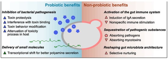 Previous studies have identified diverse functionalities of Sb against the host and pathogens including control of the balance of intestinal microbes, disruption of the colonization and infection of pathogens on the mucosa, local and systemic immune response adjustment, and stabilization of the gastrointestinal barrier function. It has been reported that lyophilized Sb products carry a higher number of viable cells and outperform heat-killed Sb products regarding the pharmacokinetics and probiotic stability at room temperature [1], but the efficacy difference between the two product types may vary depending on whether the mechanism of action is probiotic or parabiotic. In the case of Sc, a few health benefits of its intake have been reported but mostly from a nutritional perspective [19]. Despite the considerable genetic similarity, the efficacies of Sc as a prophylactic or therapeutic avenue against gastrointestinal disorders have not been studied as thoroughly as those of Sb. Considering their genotypic and phenotypic similarities, however, Sc may also provide some of the reported benefits of Sb. The following subsections introduce detailed examples of the probiotic and non-probiotic mechanisms of the health benefits of the Saccharomyces yeasts (described in Figure 1 and Table 1).