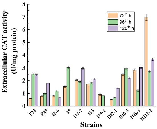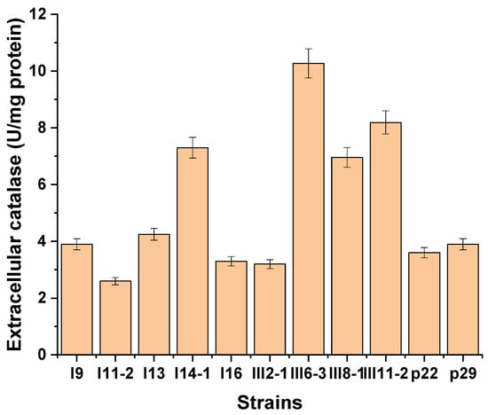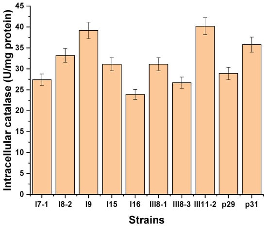 The best production of intracellular catalase was shown by strains p29 (28.9 U/mg), III11-2 (40.2 U/mg), p31 (35.8 U/mg), I9 (39.2 U/mg), III8-1 (31.0 U/mg), I8-2 (33.2 U/mg), I7-1 (27.4 U/mg), III8-3 (26.7 U/mg), I15 (31.1 U/mg), and I16 (23.9 U/mg).