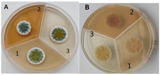 Macroscopic photos of the model strain cultured on three agar media (1—PDA, 2—SA, and 3—CzDA); (A) front side, (B) reverse side.