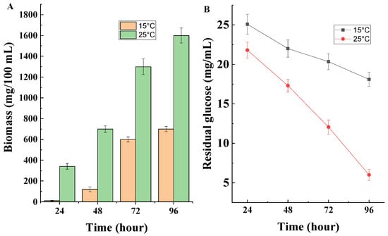As illustrated in Figure 5A, the highest amount of biomass was formed at a growth temperature of 25 °C, which confirmed the affiliation of the strain to mesophilic fungi. At the lower temperature used, a slower development of the model strain was observed. The carbon source uptake results were consistent with the development of the strain at the two temperatures used in the study. Cultivation of Penicillium rubens III11-2 at 25 °C resulted in rapid consumption of the carbon source while a decrease in the cultivation temperature slowed glucose consumption (Figure 5B).