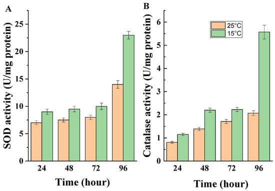 (A) Extracellular SOD and (B) extracellular CAT activity of the model strain cultured at different temperatures.