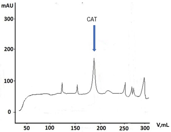 In this case, the impurities passed through the column and the enzyme bound to the hydrophobic medium in the column. The very distinct peak was evidence of the presence of the enzyme (Figure 7, Table 3). CAT was eluted with 0.1 M potassium phosphate buffer at pH 7.5. Next, the resulting enzyme was concentrated using centrifuge tubes with a filter permeability of 10 kDa.