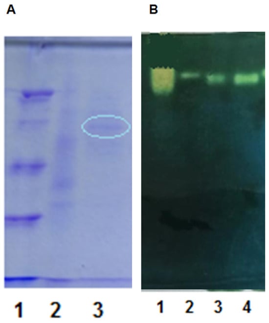 The purity of the resulting active fraction was checked using SDS-PAGE. In Figure 8A, a streak (marked in a circle) of the purified enzyme fraction is visualized. The presence of the enzyme was visualized using native electrophoresis (Figure 8B). In accordance with the molecular standard, we assumed 42 kDa for one subunit.