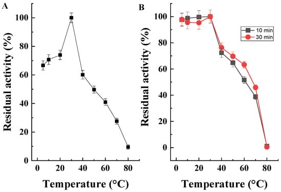 The temperature stability of the resulting enzyme was determined by measuring enzyme activity after treatment with temperatures of 5, 10, 20, 30, 40, 50, 60, 70 and 80 °C for 10 and 30 min, respectively.