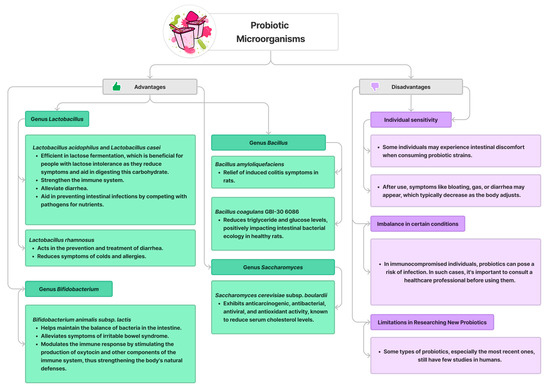 In this sense, the advantages [47,48,49,50,51,52,53,54,55,56] and disadvantages [57,58,59] of using probiotic microorganisms in functional yogurts stand out, as shown in Figure 1.