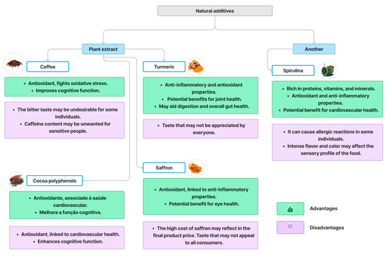 Considering the mentioned natural additives, the advantages and disadvantages of the use of coffee [64,65,66,68,95,96], cocoa polyphenols [79,80,81,82,97,98], turmeric [84,85,86,99], saffron [87,88,89,90,91,100,101], and Spirulina spp. [70,71,74,75,102,103,104,105] in foods are established, which can be visualized in Figure 2.
