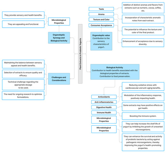 However, natural additives can serve multiple purposes, and their inclusion in foods can improve both organoleptic properties [106,107,108,109,110,111,112] and biological activity [113,114,115,116,117,118,119]. In this sense, the synergy of these factors in integrating plant extracts in probiotic yogurts stands out, as seen in Figure 3.