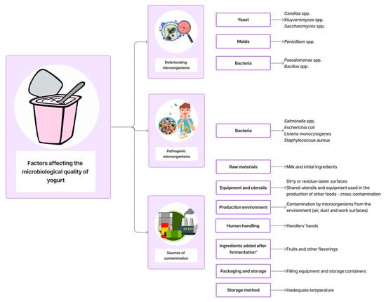 Among the challenges in maintaining the viability and microbiological quality of yogurt are deteriorating and pathogenic microorganisms as well as sources of contamination [141,142,143,144], as can be seen in Figure 4.