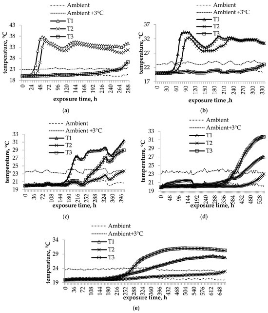 Temperature dynamics during aerobic exposure in high-moisture barley grain ensiled for five fermentation periods and with different additives. T1—control (tap water, T2—SiloSolve® FC (Lactococcus lactis (DSM 11037) and Lentilactobacillus buchneri (DSM 22501)—50:50), T3—AIV Ässä Na (Formic acid—58.3; Propionic acid—20.1; Sodium formate—5.2; Potassium sorbate—2.5; Colorant—0.1; Water—13.8). (a) Day 7 of fermentation; (b) day 14 of fermentation; (c) day 28 of fermentation; (d) day 60 of fermentation; (e) day 90 of fermentation.