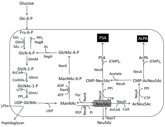 Anabolic pathway of PSA synthesis using glucose as a substrate. NanA Neu5Ac aldolase, NanT sialic acid transporter, NanK ManNAc kinase, NanE ManNAc-6-P epimerase, GlmS L-glutamine:D-fructose-6-phosphate aminotransferase, GlmM phosphoglucosamine mutase, GlmU bifunctional UDP-N-acetylglucosamine pyrophosphorylase/glucosamine-1-phosphate N-acetyltransferase, NagA N-acetylglucosamine-6-phosphate deacetylase, NagB glucosamine-6-phosphate deaminase, NeuA CMP-Neu5Ac synthetase, NeuS α-Neu5Ac α-2,8-sialyltransferase, NeuB Neu5Ac synthase, NeuD Neu5Ac 7-O (or 9-O)-acetyltransferase. Fru-6-P fructose-6-phosphate, GlcN-6-P D-glucosamine-6-phosphate, GlcN-1-P aminoglucose, GlcNAc-1-P N-acetyl-D-aminoglucose1-phosphate, UDP-GlcNAc Nucleotide sugar, ManNAc N-acetyl-D-mannosamine, ManNAc-6-P ManNAc-6-phosphate, GlcNAc-6-P N-acetyl-D-Glucosamine phosphate, Neu5Ac N-Acetylneuraminic acid, AcNeu5Ac acetylated N-Acetylneuraminic acid, CMP-Neu5Ac sialic acid glycine monophosphate, CMP-AcNeu5Ac acetylated sialylglycerol monophosphate, PSA polysialic acid.