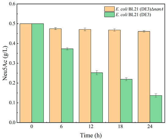 In the process of producing PSA using Escherichia coli, a small amount of Neu5Ac enters the PSA synthesis branch, and most of it is decomposed by the Escherichia coli Neu5Ac decomposition pathway [24]. To explore the effect of knocking out the nanA gene on blocking the Neu5Ac decomposition pathway in Escherichia coli, a certain amount of Neu5Ac was added externally before sterilizing the liquid LB medium, so that the initial concentration of solution was 0.5 g/L; the E. coli BL21 (DE3)ΔnanA and E. coli BL21 (DE3) were inoculated separately. During the cultivation process, samples were taken at 0 h, 6 h, 12 h, 18 h, and 24 h to compare changes in Neu5Ac concentration in the culture medium before and after knocking out the nanA gene, and to analyze the degradation of Neu5Ac after knocking out the nanA gene. A gradual decrease was observed in the concentration of Neu5Ac in the E. coli BL21 (DE3) medium, as shown in Figure 2; in contrast, Neu5Ac concentrations in the medium of E. coli BL21 (DE3)ΔnanA were almost stable for 24 h. It was demonstrated that the successful knockout of the nanA gene deprived E. coli BL21 (DE3) of its ability to catabolize Neu5Ac.