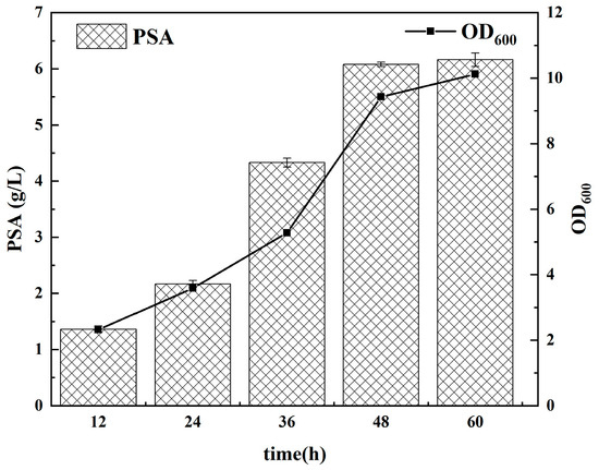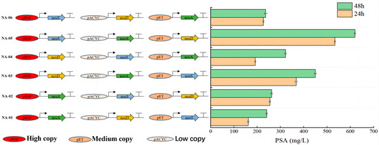 E. coli BL21 (DE3) and derived strains were used for PSA production. All strains were grown in LuriaBertani (LB) for seed preparation and PSA biosynthesis. The LB medium contained 10 g/L peptone, 5 g/L yeast extract, and 10 g/L NaCl. Yeast powder and peptone were provided by Angel Yeast Co., Ltd. (Yichang, China). The corresponding solid LB medium was supplemented with 2% agar powder. The sterilization conditions were 121 °C for 20 min. When necessary, the medium was supplemented with 50 mg/L kanamycin (Kan), 50 mg/L ampicillin (Amp), 25 mg/L chloramphenicol (Chl), and 30 mg/L spectinomycin (Spe) prior to inoculation.