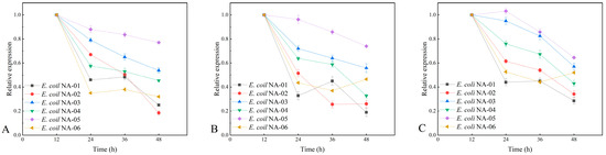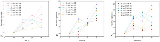 The six engineered strains differed considerably in their ability to synthesize polysialic acid, and it is clear that differences in the expression of their genes under the influence of different copy number vectors are a potentially important reason for the differences in their ability to polymerize sialic acid. High-copy-number vector-expressed neuS drives the synthesis of high yield polysialic acid, whereas low-copy neuD constitutes a bottleneck in the polymerization of sialic acid. In the plasmid stability experiment, the level of plasmid loss was higher with fermentation. Therefore, we continue to determine the stability of exogenous gene expression in six strains of engineering bacteria using quantitative fluorescence PCR to analyze the relationship between it and the yield of polysialic acid, and to identify engineering bacteria with optimal performance. The fermentation broth of six recombinant-engineered bacteria at different fermentation times (12 h, 24 h, 36 h, and 48 h) was subjected to quantitative fluorescent PCR analysis at standard antibiotic concentrations to determine the relative expression changes of the three genes (neuA, neuD, and neuS), and the results are shown in Figure 7.
