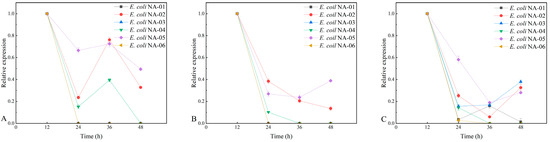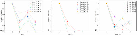 The cells were collected and the total RNA was extracted, and then reverse transcription cDNA was synthesized. 16S was selected as the internal reference gene for this study, and the primers were designed using Oligo7, as in Table S3, and synthesized by Shanghai Bioengineering Co. (Shanghai, China). The cDNA obtained from reverse transcription was used as template for a fluorescence quantitative PCR reaction. The data were processed and that of 12 h in this experiment was set as 1. The relative expression level at different time periods was analyzed and ploted.