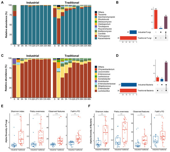 After normalization, 41,943 reads per sample (corresponding to the sample with the lowest reads) were used for diversity analyses. Alpha diversity indexes showed significant differences between the two fermentation modes, with traditional fermentation exhibiting significantly higher fungal diversity compared to the industrial fermentation (p < 0.001) (Figure 2E). The changes in the alpha diversity of the fungal communities during the industrial and traditional fermentation were analyzed separately (Figure S3). The Shannon and Pielou indexes which indicate the richness and evenness, respectively, of the fungal communities in different stages during the traditional fermentation process differed significantly (p < 0.05) (Figure S3).