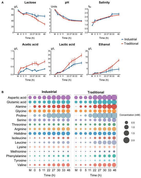 A similar trend of pH change was observed in the industrial and traditional fermentation processes. At the beginning, the pH of the mare’s milk in the traditional mode was 6.8, higher than that (6.6) in the industrial mode (p < 0.05), probably due to the pasteurization of the raw milk in the latter. However, at the end of fermentation, the pH of the traditional fermentation (pH 3.3) was lower than that (pH 3.5) of the industrial fermentation (p < 0.05) (Figure 3A and Figure S7). The salinity increased slowly during fermentation, ranging from approximately 1‰ to 2.5‰, with no significant differences observed between the fermentation modes. Initially, the lactose content in the mare’s milk was around 74.4 g/L, then it gradually decreased to 55.3 g/L and 28.3 g/L at the end of the industrial and traditional fermentation modes, respectively (p < 0.05) (Figure 3A and Figure S7). Consequently, the lactose utilization rate was 25.7% in the industrial mode and 62.0% in the traditional mode. Acetic acid, lactic acid, ethanol, and amino acids were monitored and quantified as major flavor substances of koumiss. While these substances were almost absent or present in very low concentrations in the mare’s milk, they showed a progressive increase during the fermentation process. Significant differences in their concentrations were observed between the traditional and industrial fermentation modes (p < 0.05) (Figure 3 and Figure S7). Acetic acid showed a low concentration at the end of fermentation, reaching 0.4 g/L and 0.8 g/L in the industrial and traditional modes, respectively, while lactic acid showed a higher concentration at the end of fermentation, reaching 14.8 g/L in the industrial mode and 24.6 g/L in the traditional mode. Ethanol gradually increased to 4.5 g/L and 12.1 g/L in the industrial and the traditional modes, respectively.