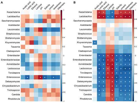 Spearman correlations between microbes and physicochemical characters: (A) Industrial fermentation; (B) Traditional fermentation. The color of the scale indicates the type of correlation: “1” represents a perfect positive correlation (dark red) and “−1” represents a perfect negative correlation (dark blue). * p < 0.05. Umami, sweetness, and bitterness are expressed by the sum of the concentrations of the amino acids contributing to each taste.
