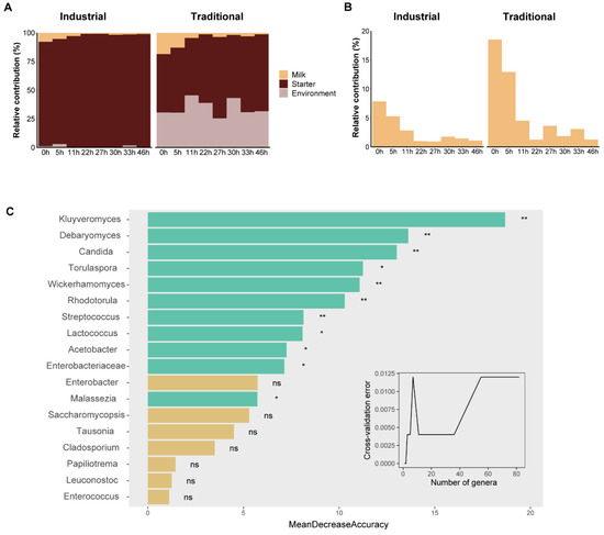 Source tracking and random forest analyses of microbial communities. The relative contributions of various (mare’s milk, starter, and environment) sources (A) and mare’s milk (B) to the bacterial communities in different fermentation stages. (C) The importance of genera to distinguish fermentation modes and the significantly important genera are indicated by green bars with asterisks. ns, p > 0.05; *, p ≤ 0.05; and **, p ≤ 0.01.