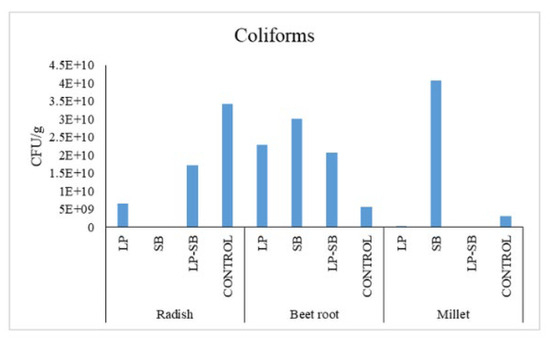 Table 5 shows the efficiency of probiotic production in different sprouts, where significant differences were observed among the seed groups. Beet sprouts demonstrated greater viability for S. boulardii (1.35 × 1012 ± 8.46 × 10 c), while millet sprouts exhibited higher viability for L. plantarum (2.90 × 1011 ± 3.62 × 10 a). During the imbibition stage, probiotics are absorbed by the seeds, gaining better access to available nutrients and thus achieving optimal development. Factors such as imbibition and germination temperature, the method of inoculating the imbibition medium, the seed type, and post-germination conditions directly influence the efficiency of probiotic-rich sprout production [11]. Additionally, the microorganism used to inoculate the seeds can change its metabolism depending on the seed occupied.