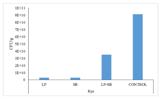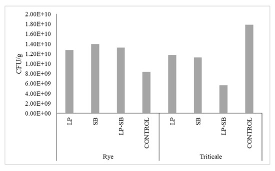 The microbiological quality of the sprouts improved in those treated with probiotic microorganisms. Figure 1 and Figure 2 show total coliforms present in sprouts; as can be seen, lentil sprouts showed the lowest amount of CFU/g of total coliforms and aerobic mesophiles (Figure 3), while triticale and rye sprouts had the highest content of mesophiles. Regarding fungi and yeast, triticale had lowest counts for fungi and yeasts (Figure 4). Abadias et al. (2018) [40] reported that in more than 40% of sprouted foods, mesophilic bacteria counts exceeded 8 log CFU/g. Sprouts enriched with yeast and probiotic bacteria were characterized by significantly higher yeast counts; however, the fungal population was significantly reduced. The total fungal count may have been influenced by water activity values. The concentration of aerobic mesophiles can be attributed to factors such as the origin of the seed, contaminated soils, irrigation water, cross-contamination with other batches, inadequate handling and storage, and the proliferation of microorganisms on the grain’s surface due to the conditions of the germination process, such as soaking (Figure 3 and Figure 5) [41,42]. It can be assumed that ecological competition plays a key role in reducing mold and coliform populations. Antagonistic effects of probiotic microorganisms against foodborne pathogens have been previously reported in sprouts [43], dairy products [44], and fruits and fresh vegetables [45]. It is important to note that good sanitation practices are essential for reducing pathogenic microorganisms, with the use of chlorinated water, disinfectants, radiation, heat, and high pressure being recommended [28].