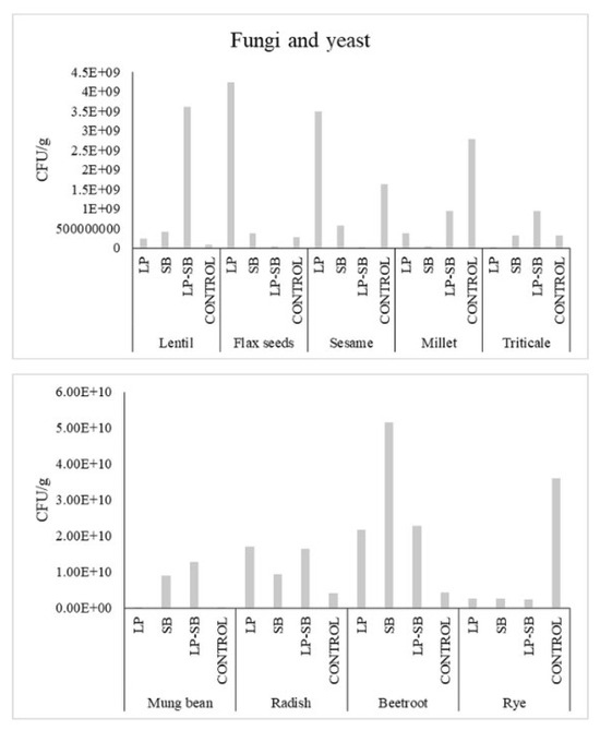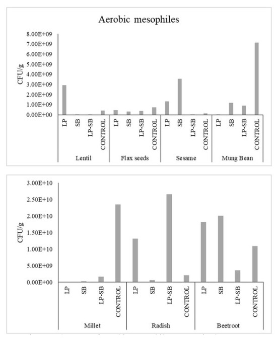 In oilseed sprouts, flaxseed inoculated with L. plantarum exhibited values considered suitable for a food to be classified as carrying probiotics (minimum amount of 1 × 106). However, no significant differences were found within this seed group. For legume seeds, the highest values occurred in lentils inoculated with the combination of both probiotic microorganisms. The same was true for vegetables in beets inoculated with the mixture. In cereals, triticale with L. plantarum reached higher counts. Statistical analysis revealed significant differences among the seeds, which can be attributed to their varying nutritional compositions. A common factor among the treatments with better counts for efficiency and probiotic production was the presence of L. plantarum [69].