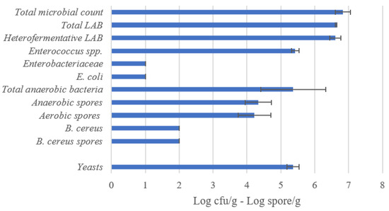 The results regarding the microorganisms analyzed in oat okara flour are shown in Figure 1. A high aerobic TMC (6.65 log cfu/g) was detected, while anaerobic bacteria were lower (5.37 log cfu/g). Similar values to the TMC were found for total lactobacilli count (6.64 log cfu/g) and heterofermentative lactobacilli (6.61 log cfu/g). Minervini et al. [24], studying 19 different types of Italian sourdough produced with durum wheat flour, associated the high presence of sugars such as maltose, glucose, and fructose and high levels of free amino acids in the flour with bacterial flora in the sourdough composed mainly of obliged heterofermentative LAB. Other microorganisms present in high quantities were enterococci (5.42 log cfu/g) and yeasts (5.36 log cfu/g). Enterobacteriaceae and coliforms were not detected (value < 1 log cfu/g). Bacillus cereus was not found in the flour samples (<2 log cfu/g); however, other authors have detected Bacillus spp. in low-moisture foods such as flour and various starchy foods [25,26].