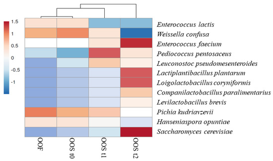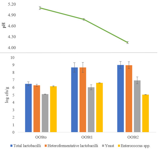 For the OOS samples, microbiological analyses were carried out to evaluate the spontaneous fermentative microflora, total lactic acid bacteria, heterofermentative LAB, yeast, and enterococci counts were performed. Sample preparation for analysis was performed as described above.