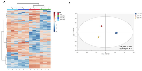 Heat map resulting from the hierarchical clustering analysis (A) and OPLS-DA score plot (B) were both built considering the chemical profile of the different samples (OOF, OOS-t0, OOS-t1, and OOS-t2).