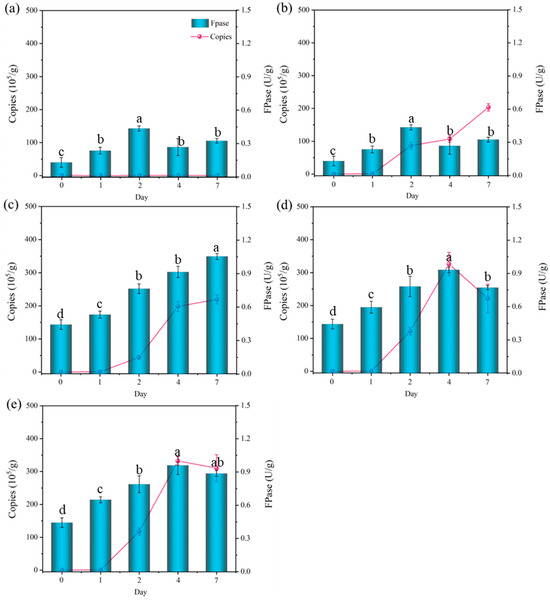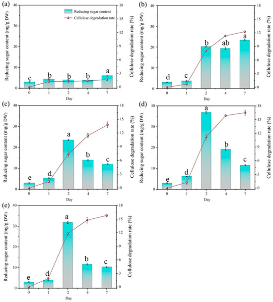 3.1.2. Effect of Oxygen Supply on Cellulose Degradation and Reducing Sugar Production of Distillers’ Grains