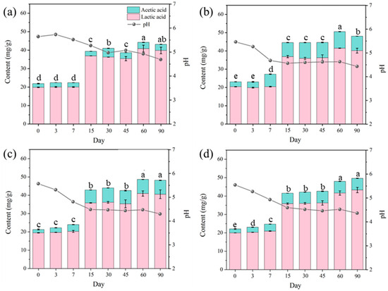 3.3.1. The Effect of Different Lactic Acid Bacteria Inoculation on the pH and Organic Acid Content
