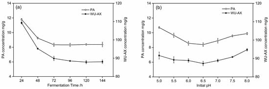 Effects of fermentation time (a) and initial pH (b) on the PA and WU-AX contents. PA, phytic acid; WU-AX, water-unextractable arabinoxylan.