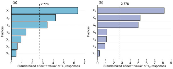 Pareto chart illustrating the effects of seven variables on the responses of Y1 (a) and Y2 (b). Variables with t-values exceeding the critical value of 2.77 are considered statistically significant. X1, fermentation time, hour; X2, fermentation temperature, °C; X3, initial pH; X4, inoculum dose, %; X5, particle size, μm; X6, substrate filling rate, %; X7, material-to-liquid ratio; Y1, the content of phytic acid (PA), mg/g; Y2, the content of water-unextractable arabinoxylan (WU-AX), mg/g.